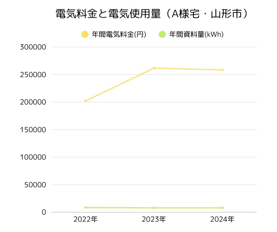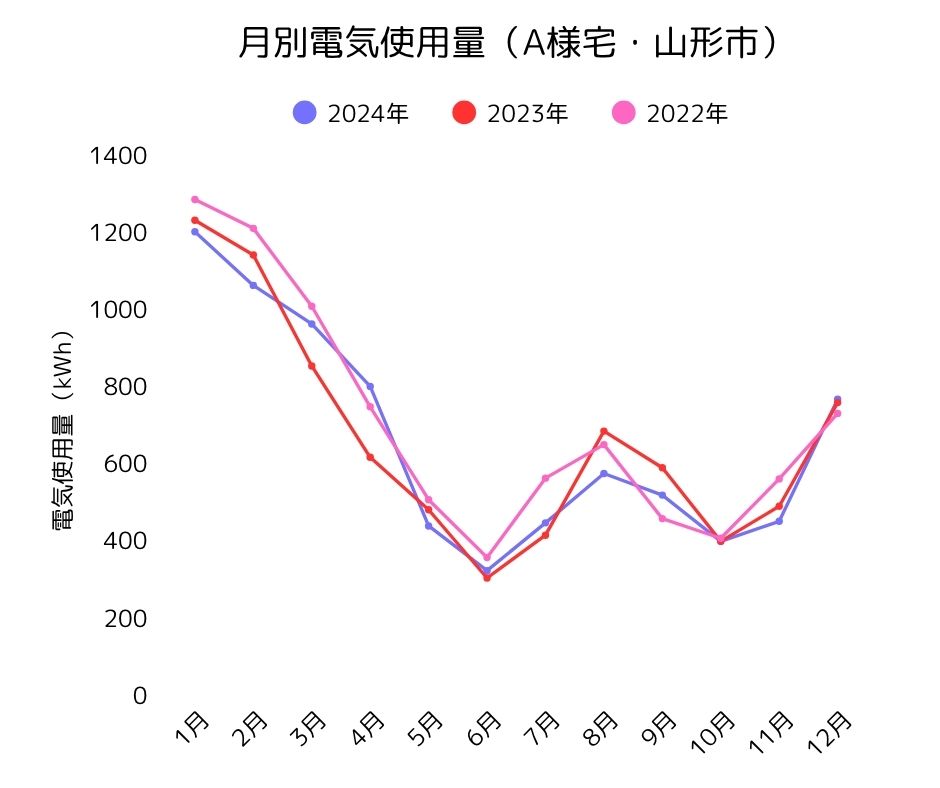 なお寒冷地の山形県では冬期間の暖房費(エアコン等)が多くなります。エアコンの使い方についてA様に聞いたところ、「夏場は3台24時間つけっ放し」「冬場も3台つけっ放しで夜寝る時だけ消す」とのことでした。