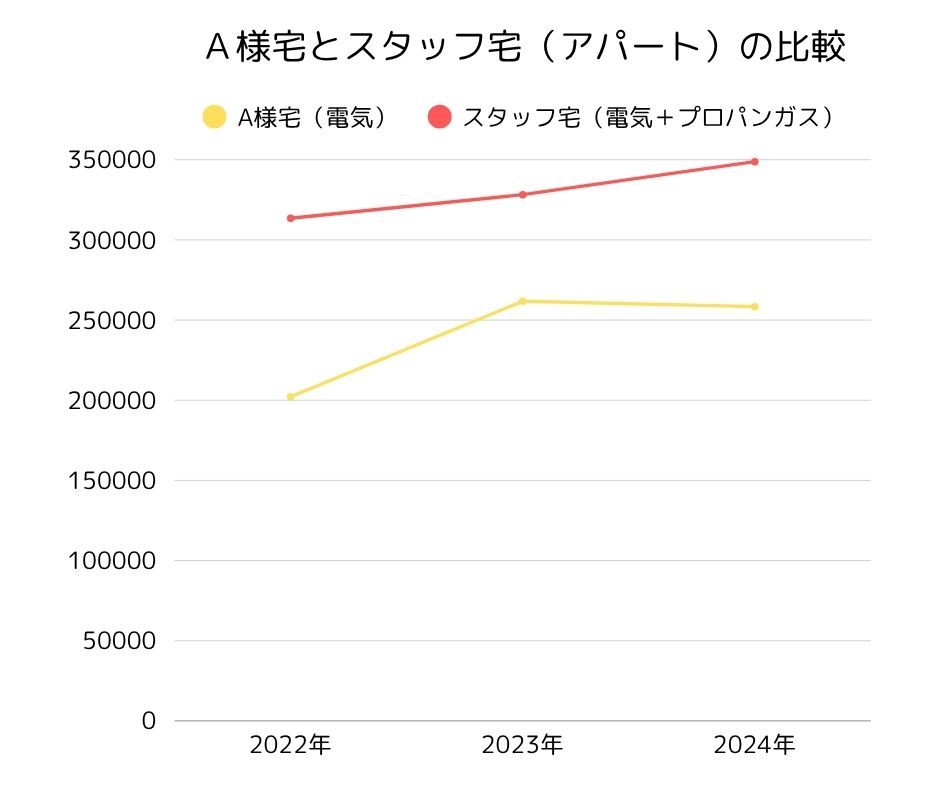 参考にA様宅とスタッフ宅(アパート)の光熱費を比較してみます。(※水道含まず)